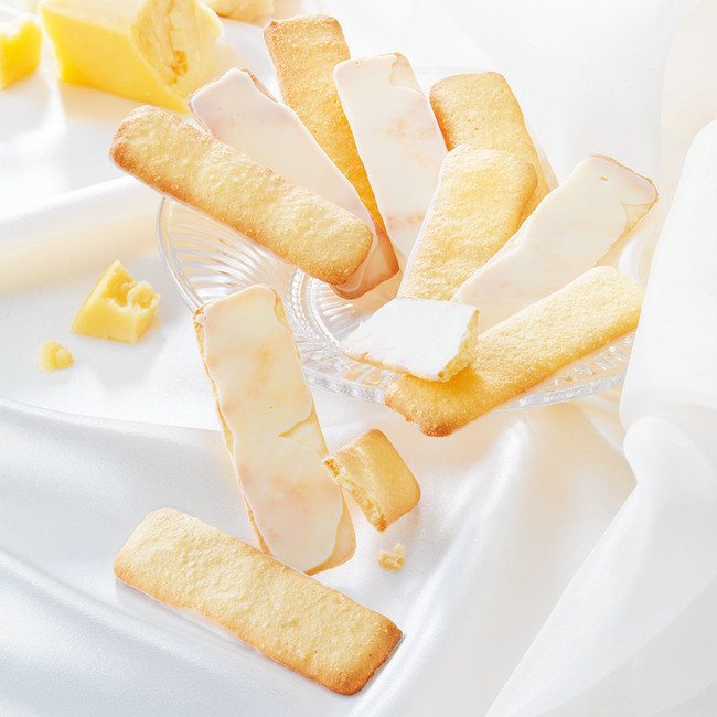 バトンクッキーは、北海道産パルメザンチーズとゴーダチーズを入れて焼き上げたクッキーの片面に、ミルクのおいしさが引き立つホワイトチョコレートをコーティングしました。チーズの塩味とホワイトチョコレートが口の中でとけ合い、まろやかな風味が広がります。