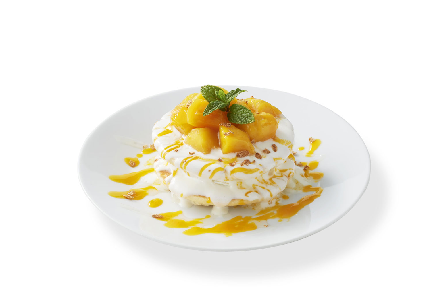 ごろっとした果肉が入ったマンゴーソースとヨーグルトソースを惜しみなくかけた、夏らしさ満載のパンケーキです。
