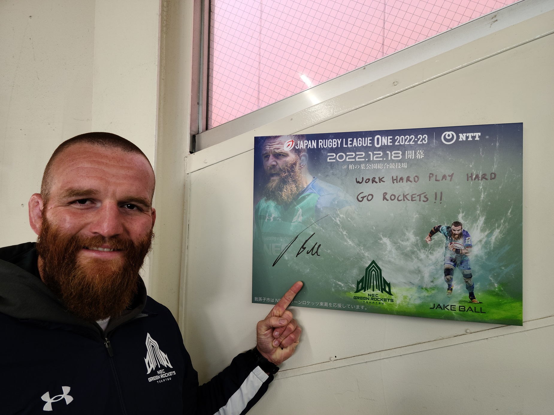 ジェイク・ボール選手は「WORK HARD PLAY HARD GO ROCKETS!!」、土井貴弘選手は「重戦車FW 応援お願いします」と、それぞれが今シーズンに向けた熱い思いを書きました。