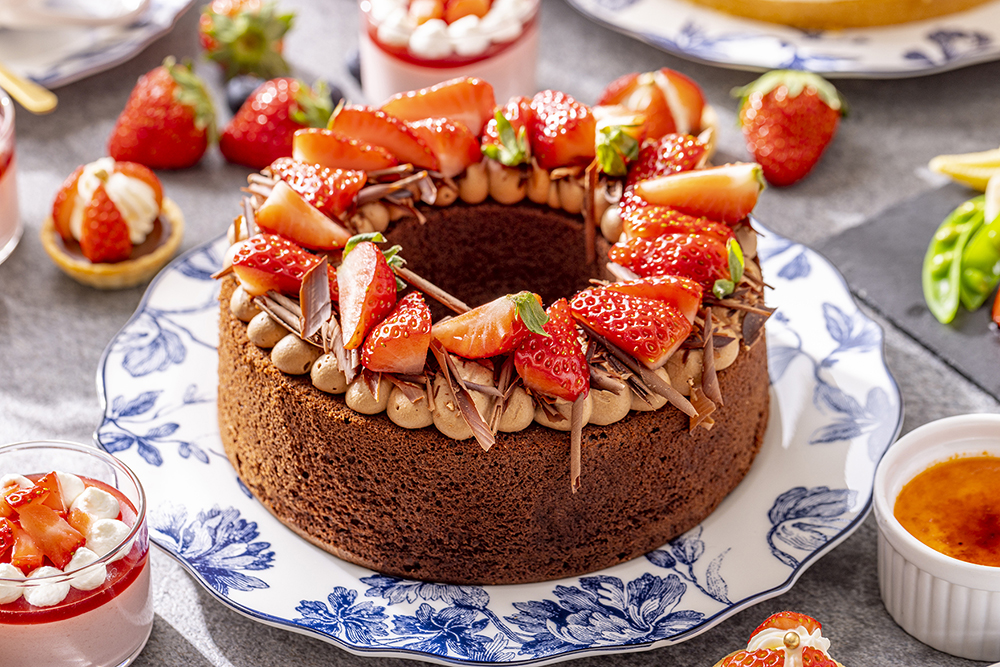 「チョコレートシフォンケーキ」は、フレッシュな苺の甘酸っぱさとチョコレートのほろ苦さのハーモニーに、時が経つことを忘れてしまいそうです。