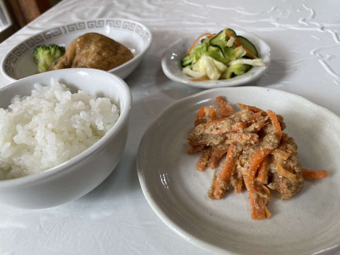 まず運ばれてきたのは小ライス、ニンジンの白和え、きのこ入り巾着の煮物、浅漬け。