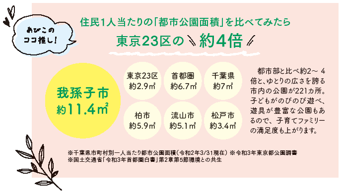 住民1人あたりの都市公園面積が、なんと東京23区の約4倍。親子で思う存分、外遊びが出来ます。駅から歩いて行ける「手賀沼公園」には、おしゃれなオープンカフェ、図書館や貸しボート屋さんがあります。移住を検討いたら、まずは遊びに来てみては。