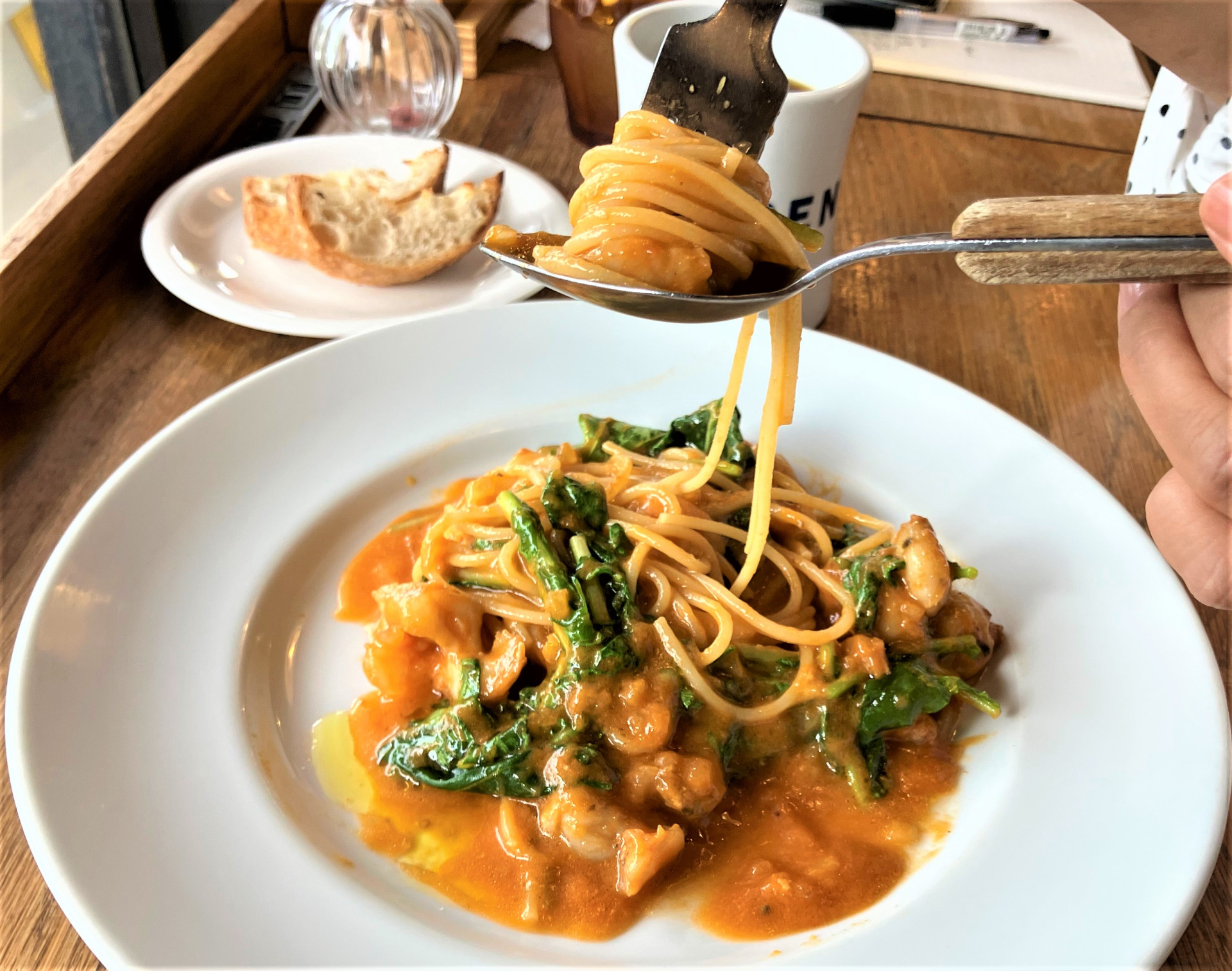 悩んだ結果、グルメ部員Hは「海老とルッコラのトマトソースパスタ」をオーダー。