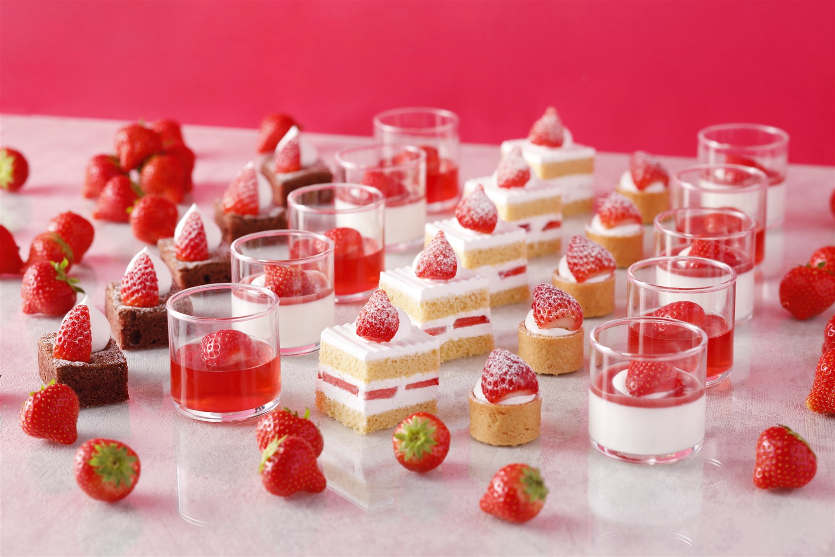 スイーツコーナーでは”イチゴの王様”「博多あまおう」をたっぷり使った品々が並びます。ショートケーキやロールケーキに加え、さっぱり頂けるゼリーやシャーベットなどさまざまなあまおうスイーツがずらり。小さめサイズになっているので、あれもこれも食べたいといった願望をしっかりかなえられますよ。