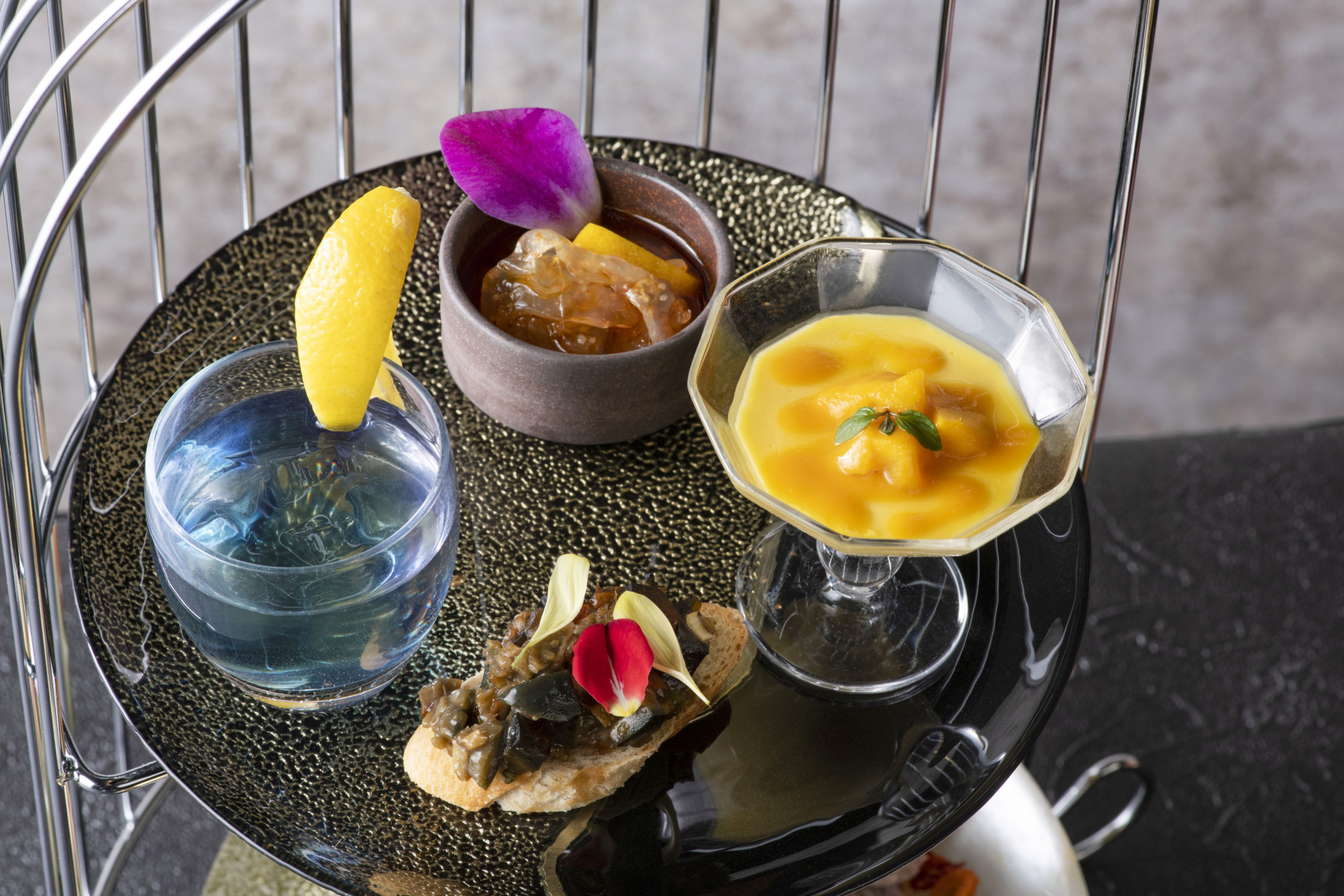 (上から時計回りに)「クラゲの酸辣風味」、「マンゴープリン」、「ピータンと揚げ生姜のカナッペ」、「愛玉(アイユー)ゼリー」