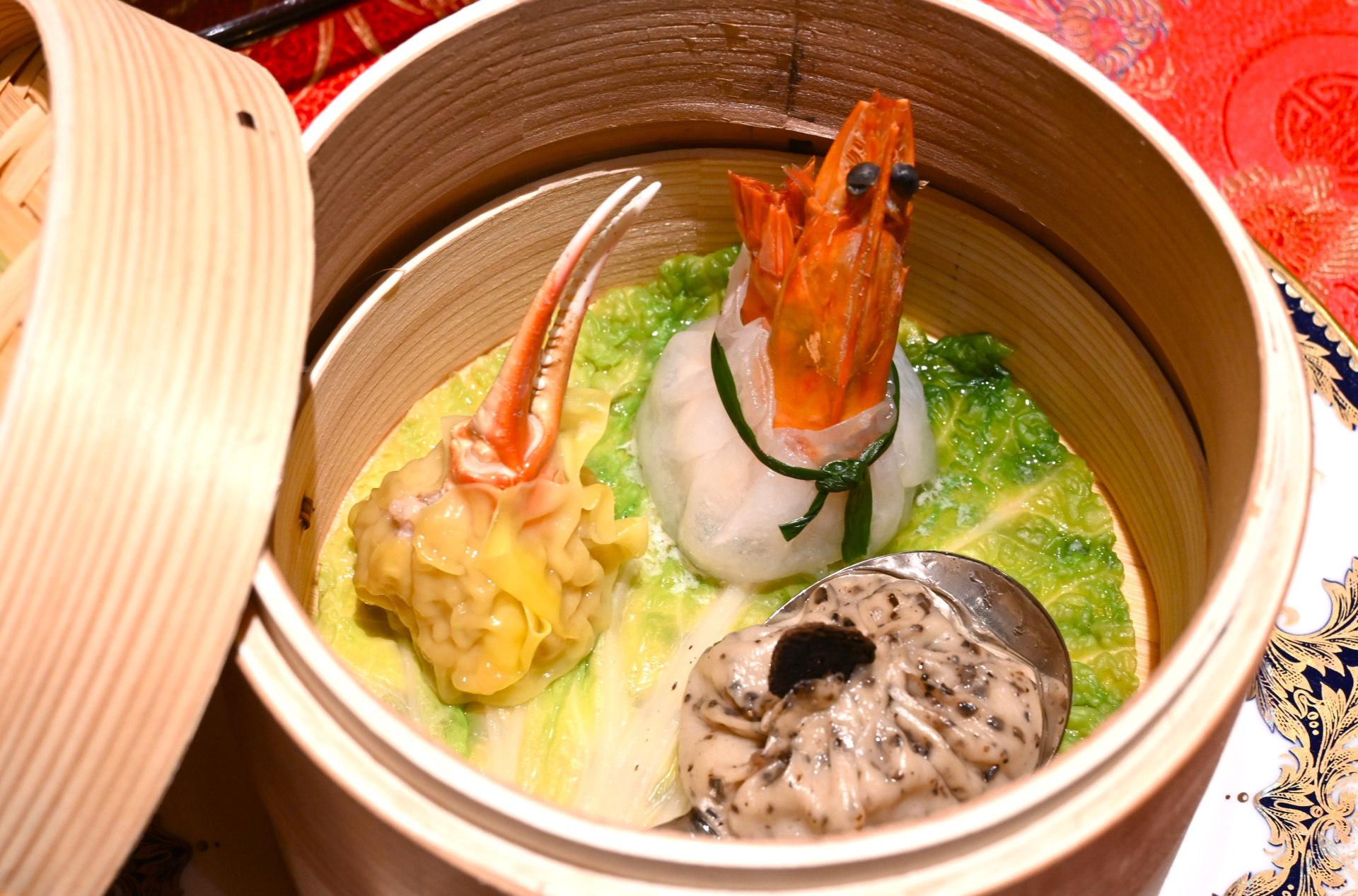 写真:「特製極上点心3種」。有頭エビ饅頭、カニ爪焼売、黒トリュフ入り小籠包(注:こちらは一人1皿1回の提供です)