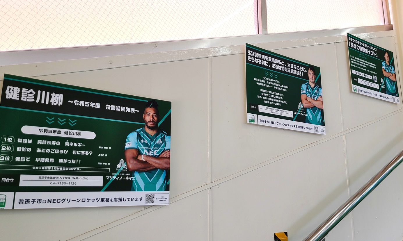 パネルには、地元ラグビーチーム、NECグリーンロケッツ東葛(GR東葛)の選手の写真が使われています。
