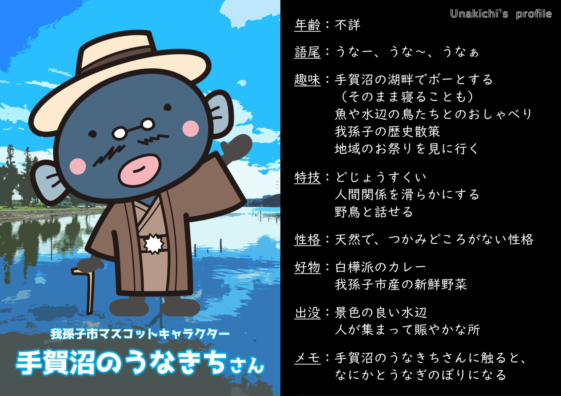 手賀沼のうなきちさんは、2012年から市のキャラクターとして活動。かつて手賀沼で獲れた鰻と、明治から大正にかけて我孫子で活動した白樺派の文人がモチーフです。