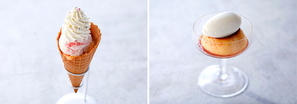 ストロベリー&ミルクのワッフルコーンアイス(左)とカスタードプリン