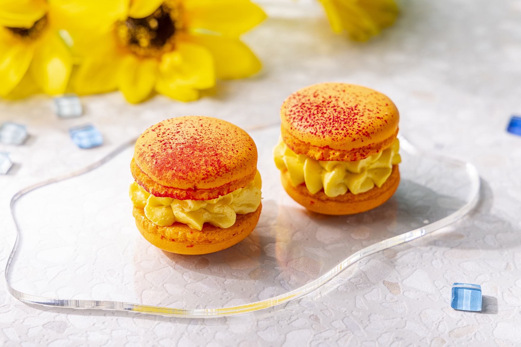 鮮やかなマンゴーカラーと、まるで本物のマンゴーのような模様が目を引く、見た目も楽しい「マンゴーマカロン」です。濃厚なマンゴーの香りが広がる、自家製マンゴージャムと、とろけるようなマンゴーバタークリームがたっぷりサンドされています。