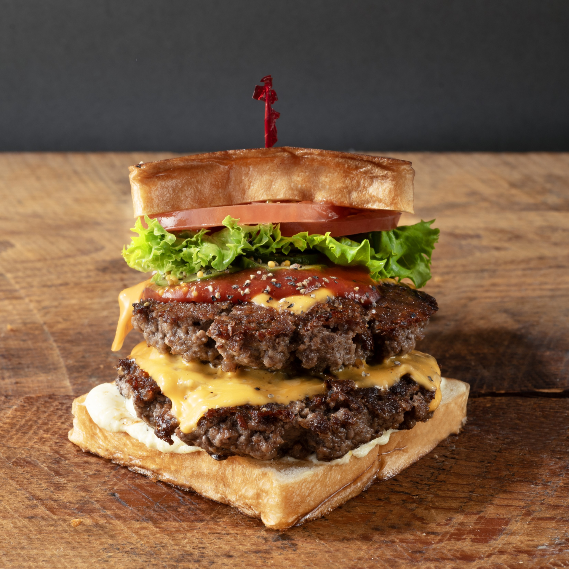 特徴は、食パンを使った四角い形のハンバーガーです。併設のベーカリーで小麦粉から仕込み、発酵や焼き上げまで行う完全自家製のバンズを使用しているのだとか。