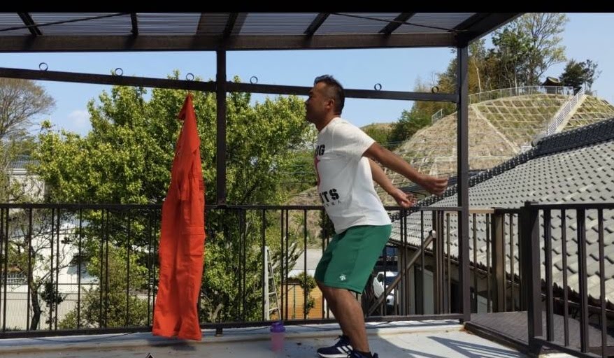 二階のベランダで撮影協力してくれた嫁ちゃんは「中途半端だから350回でしょ!(笑顔)」(鬼)
