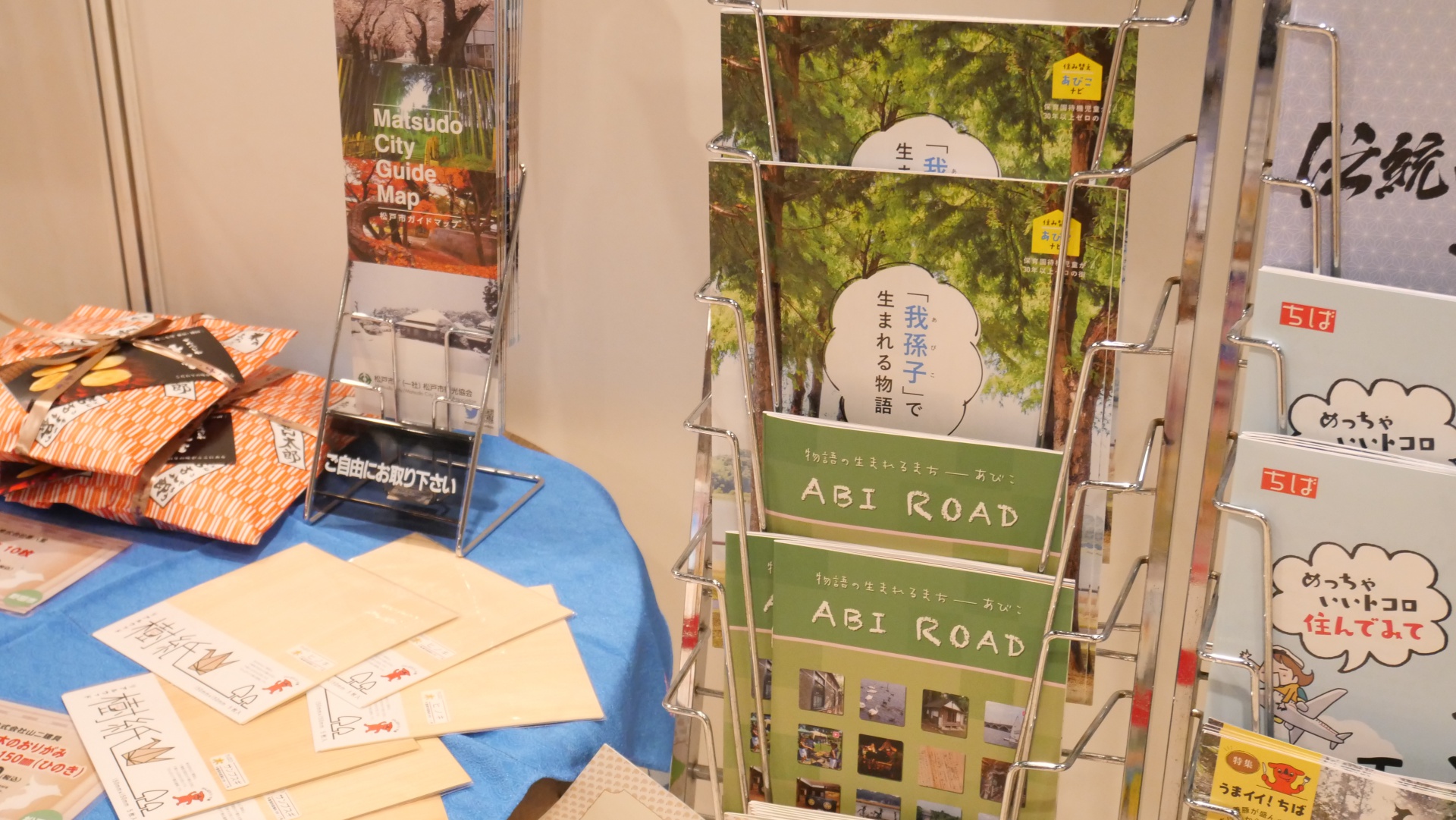 我孫子市は、初回から出展。今年は、市のシンボル手賀沼のポスターの掲示、AR機能付き観光ガイド冊子「ABI ROAD」、住み替えPR紙「住み替えあびこナビ」を配付しています。