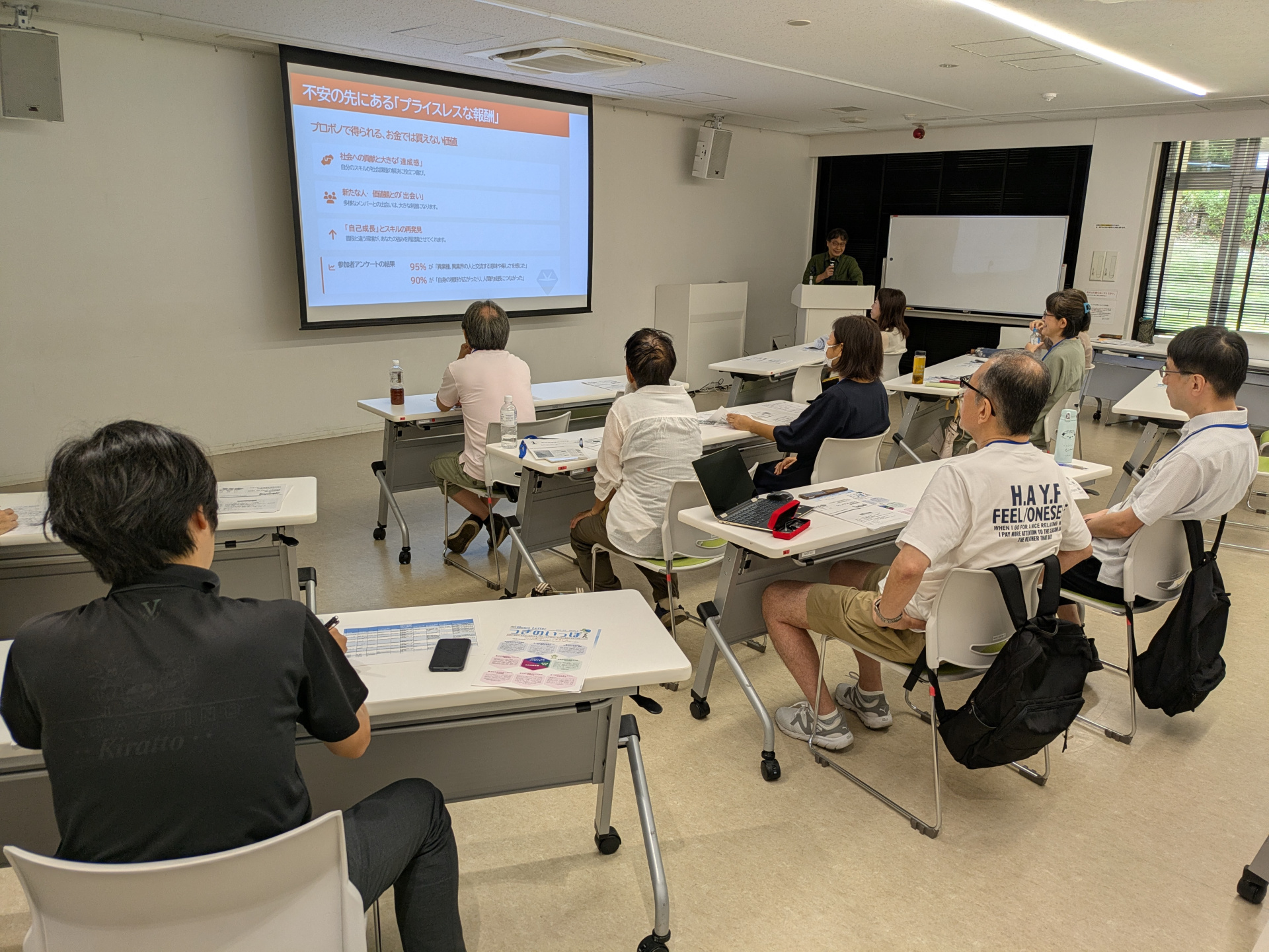 社会人ボランティアの募集説明会が、8月23日(土)にプラッツ習志野で開催されました。職場、家庭以外の第三の居場所を求めてプロボノに関心をもった人や、退職を意識する年齢になり、地域デビューとしてプロボノに挑戦してみようと思った人など、それぞれの自己紹介をしながら、事業説明のほか、昨年の参加者の活動報告や談話に興味深く、耳を傾けていました。